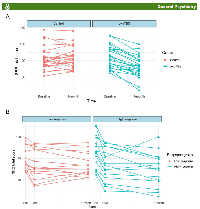 - In the a-cTBS group, the total SRS score decreased from a baseline of 95.76 to 78.52 at the 1-month follow-up (p < 0.001), whereas the historical control group showed no significant change. IPTW analysis indicated that the intervention was associated with a 17.44-point reduction in SRS scores (p < 0.001).